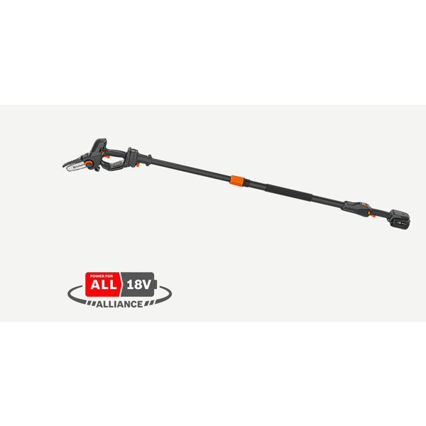 Baterijska žaga za obrezovanje, ki se uporablja s podaljškom ali brez njega. Preprosto pritrditev in nastavitev droga do 1,7 m, kar olajša doseganje višjih vej